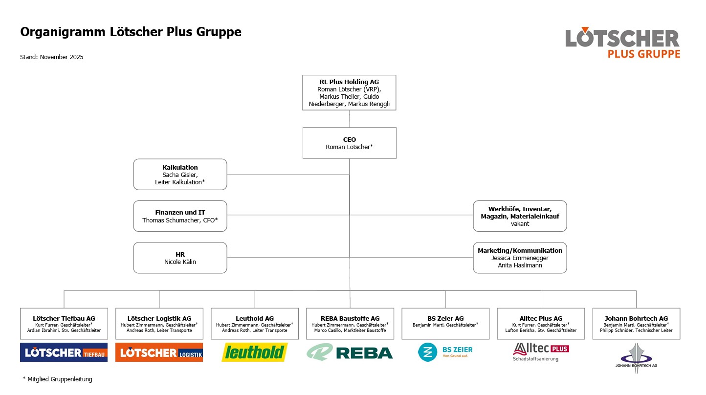 Die Lötscher Plus Gruppe besteht aus mehreren Gesellschaften und beschäftigt rund 400 Mitarbeitende. Wir sind eine erfolgreiche und zukunftsorientierte Gruppe und bieten ein vielseitiges Angebot an Baudienstleistungen an. Folgende Unternehmen gehören zur Lötscher Plus Gruppe: